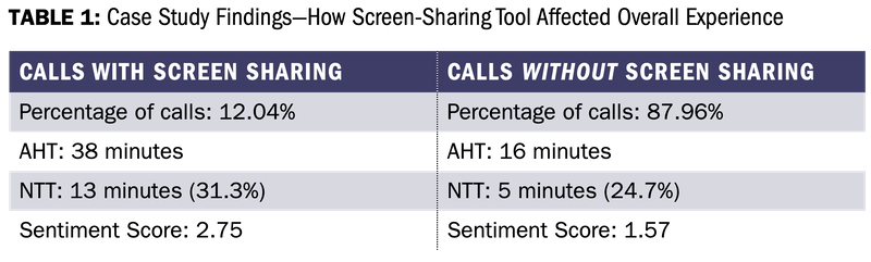 - Increased Sentiment Score. By listening to the actual phone calls, it was concluded that because the agents utilizing screen sharing answered customer’s questions to completion, a higher sentiment score was reflected (1.57 without screen sharing; 2.75 with screen sharing).